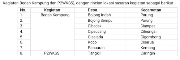Melalui RP3KP, diharapkan Kabupaten Bogor dapat melaksanakan penanganan kawasan kumuh atau Kegiatan Peningkatan Kualitas Kawasan Permukiman Kumuh dengan Luas di Bawah 10 (sepuluh) Ha, Sub Kegiatan Pelaksanaan Peremajaan Kawasan Permukiman Kumuh (Sub Sub Kegiatan Bedah Kampung dan P2WKSS), dengan rincian lokasi sasaran kegiatan sebagai berikut :