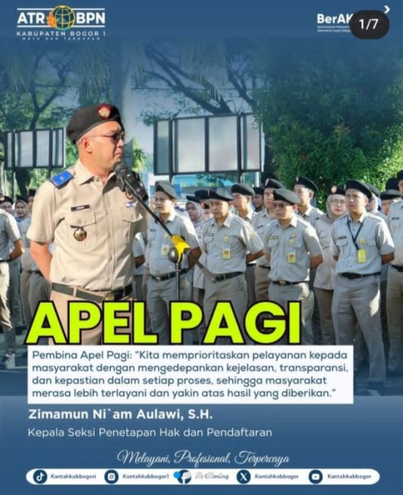 BOGOR, POVINDONESIA.COM – Kantor Pertanahan Kabupaten Bogor I atau BPN Cibinong, melaksanakan Apel Pagi yang dipimpin oleh Pembina Apel yakni Kepala Seksi Penetapan Hak dan Pendaftaran, Zimamun Ni’am Aulawi, pada Senin (13/04/26).