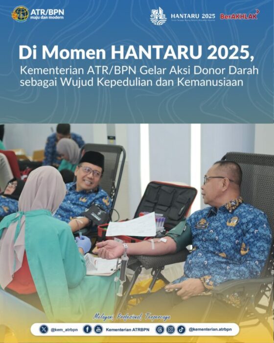 Jakarta, POVIndonesia.com – Dalam memperingati Hari Agraria dan Tata Ruang (HANTARU) Tahun 2025, Kementerian Agraria dan Tata Ruang/Badan Pertanahan Nasional (ATR/BPN) menyelenggarakan kegiatan donor darah di Aula Prona, Kantor Kementerian ATR/BPN, Jakarta, Rabu (01/10/2025).