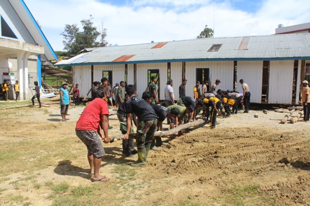 Lanny Jaya, Povindonesia.com – Personel Pos Kotis Satgas Yonif Mekanis 203/AK dan anggota Koramil Tiom serta Polres Lanny Jaya melaksanakan karya bhakti bersama dengan para jemaat Gereja GKI Betel Tiom dan juga masyarakat pendatang di Gereja GKI Betel Tiom, Distrik Tiom, Kabupaten Lanny Jaya, Papua, Minggu (12/03/2023).